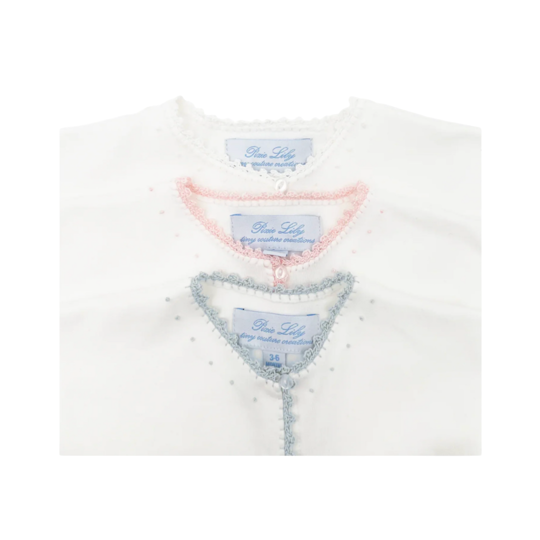 A timeless little essential. The Pixie Lily baby sack features delicate buttons at the neck, crochet detailing, French knot embroidery, and soft gathers at the hem to keep baby’s toes cozy - a sweet blend of comfort and classic charm.